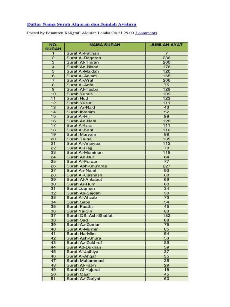 Surah ali 'imran (keluarga imran) 4. Lengkap dengan tafsir dan asbabun nuzul. Artikel yang menyajikan daftar surat dalam al quran dan jumlah ayatnya yang berisi 114 surat dan 6236 ayat, disajikan dalam bentuk tabel sehingga akan memudahkan anda dalam jumlah surat al quran dan ayatnya. > list of suras quran in the voice of abdulrahman al ossi. The quran is divided into surahs (chapters) and further divided into ayahs (verses).